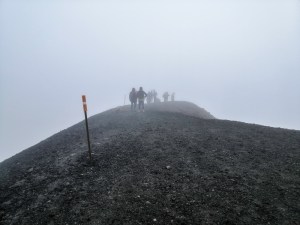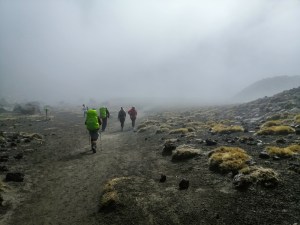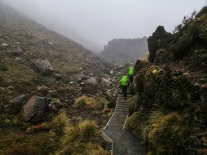 Today is meant to the hardest part of the track. We will be walking over Tongariro’s craters and climb the crater wall and into the emerald lakes on the other side. It can be physically demanding due to its terrain and steepness. Furthermore, the weather can contribute severely to its difficulty. We left early anticipating that a cold storm and rain is brewing. Sam, the warden, advised us to leave early. Under a heavy dark sky and thick fog, now invisible Tongariro and Ngauruhoe, we left Mangatepopo Hut at 7am.