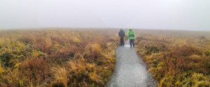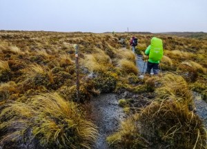 The valley landscape was stunning with golden tussock tossed around by the winds. However, low storm cloud began to sweep over from the western horizon. Soon we found ourselves too tossed around by the wind and engulfed by the dark clouds. It was 0800. many streams seem to have passed over the track. Bog formed occasionally. Fortunately, a winding boardwalk facilitated our progress. Rain, from drizzle to light, made the temperature to plummet. Hikers became silhouettes gingerly walking into oblivion. In expose places, gale force wind blew. Some area became wind tunnels. My hands were near freezing. I could hardly make out the track. The guide poles were the only aid that can be relied on.