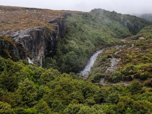 The track was relatively level with the occasional steady climb and descent. At 1100, we arrived at the Taranaki Falls Track junction. We visited the falls on day one as we anticipated today’s poor weather. Suddenly, the clouds cleared to reveal the falls, which appeared just of the main track. In the background, the fresh green beech trees. A few meters on, we crossed a bridge over the Wairere Stream. Just a few meters away, the stream disappeared over the falls. The stream looked small, but it plundered down 20 meters. From here, Whakapapa is only an hours’ walk.